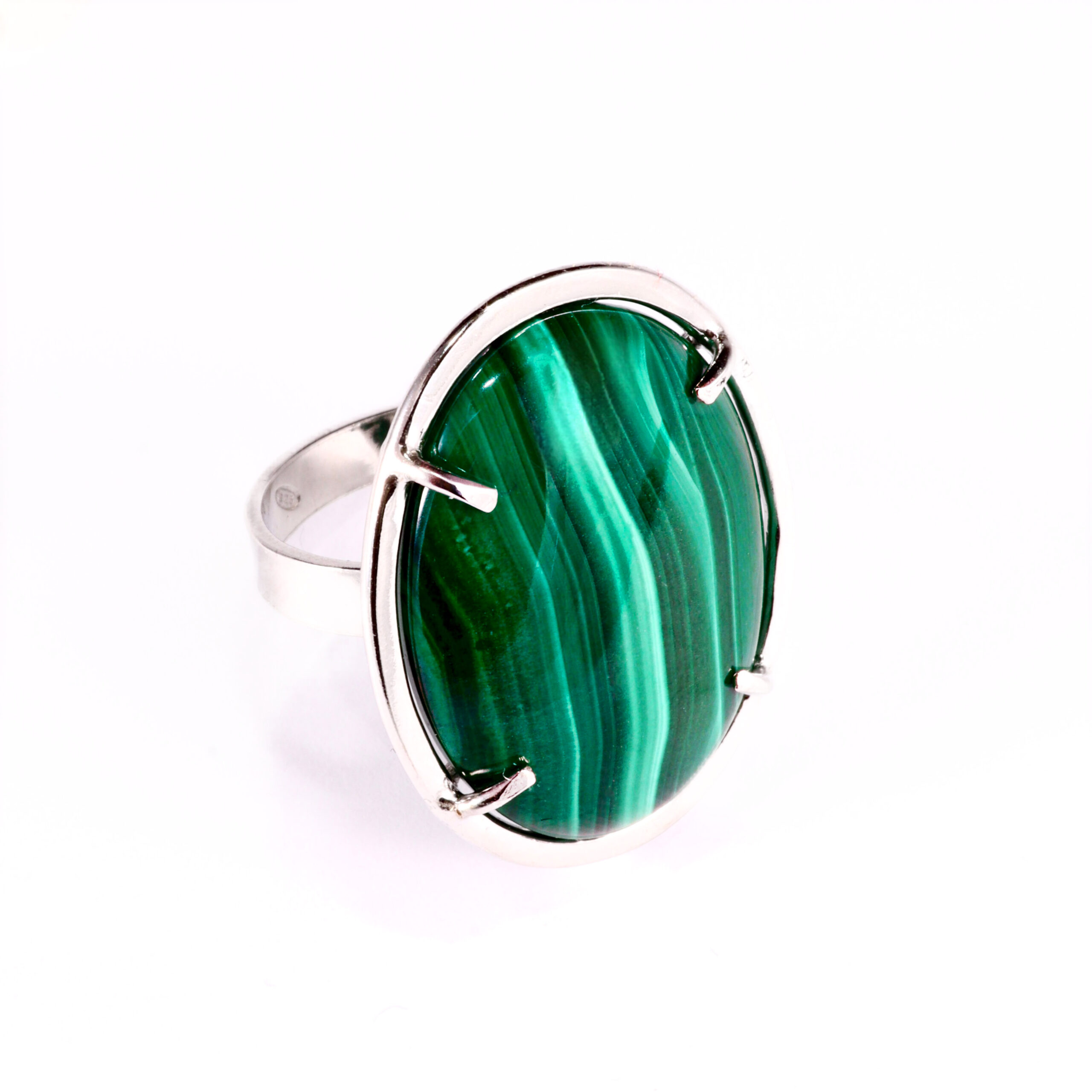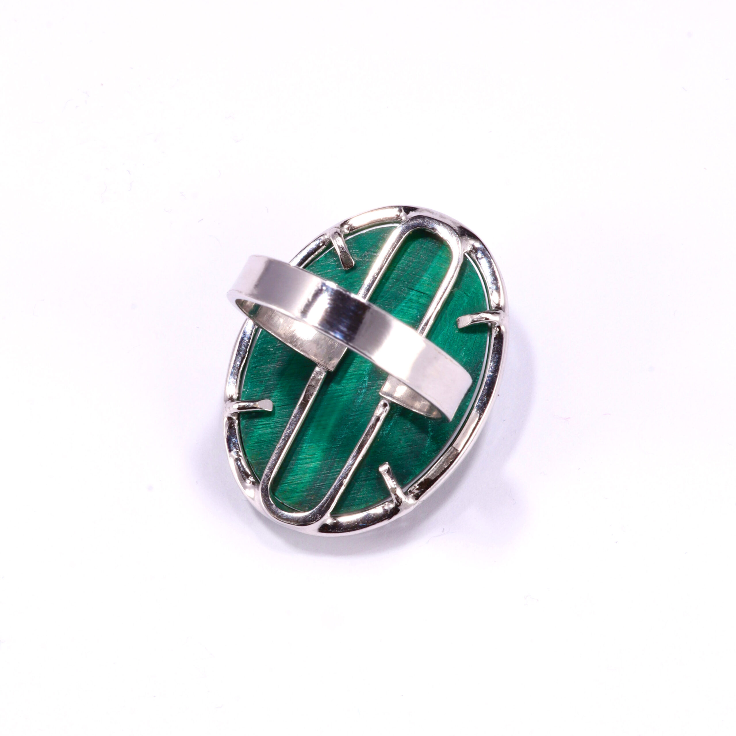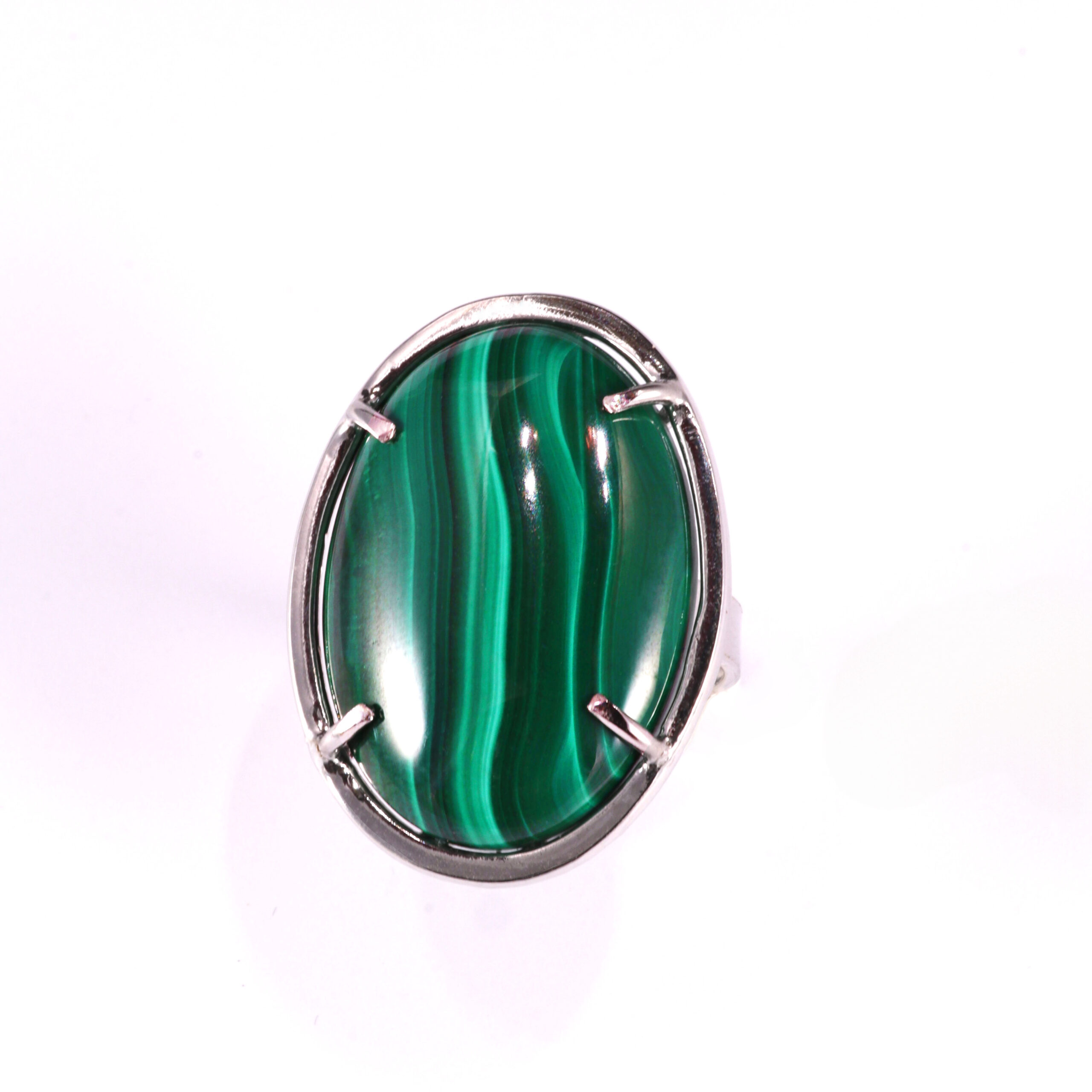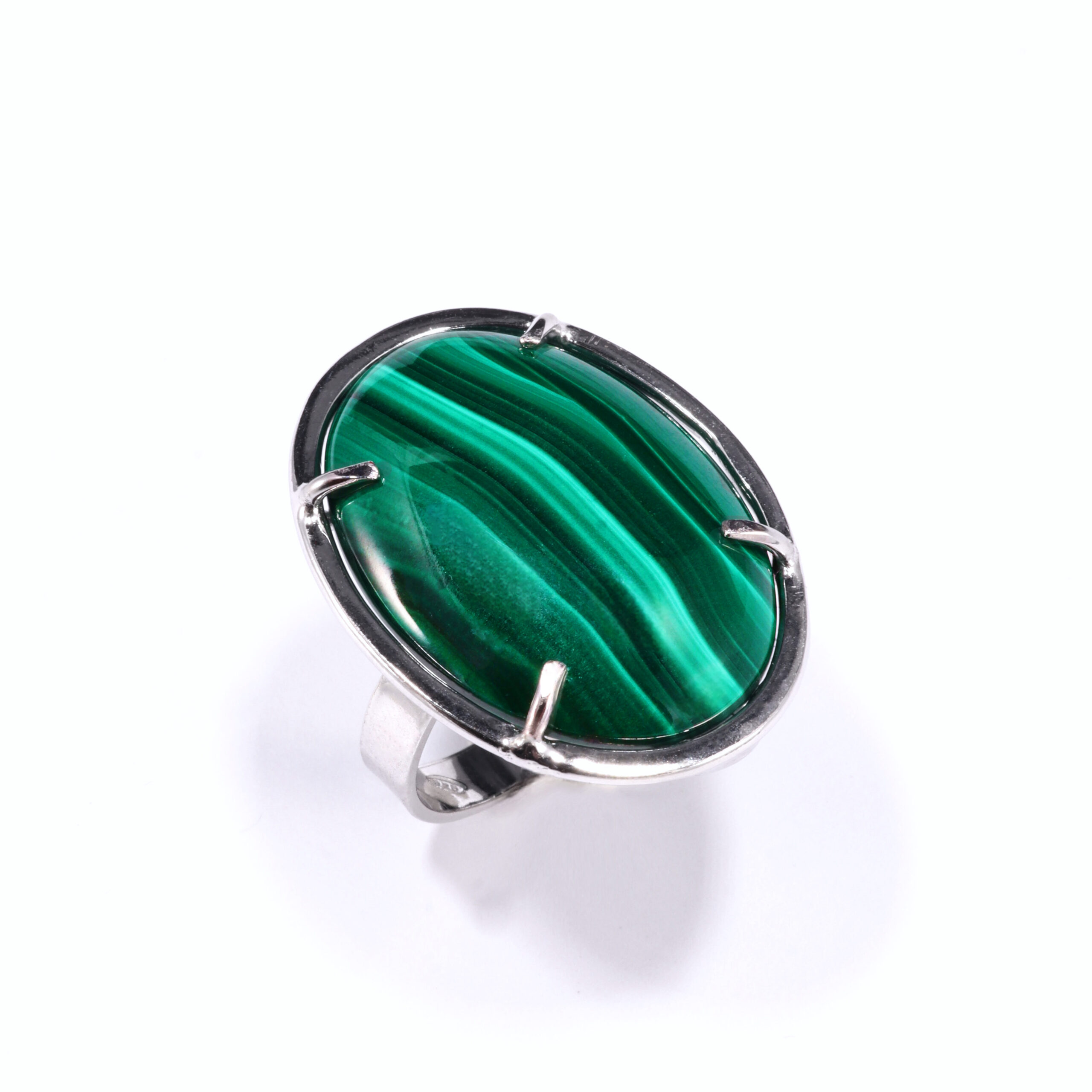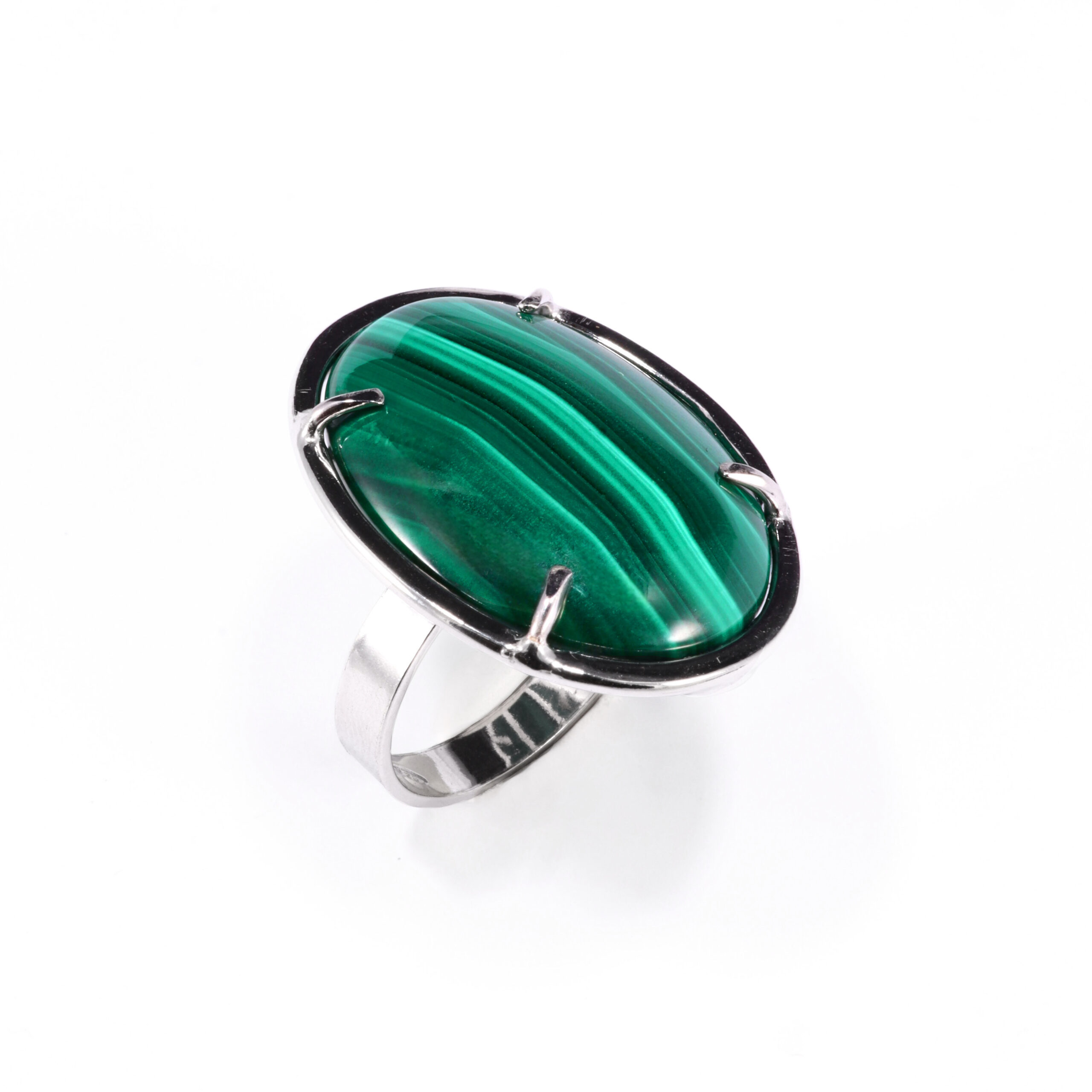 Anello con cabochon di Malachite naturale, taglio ovale, su montatura in argento 925 rodiato.
